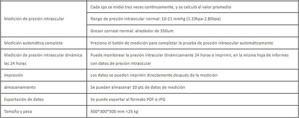•Puede monitorear la presión intraocular dinámicamente las 24 horas e imprimirla en la misma hoja de informe con los datos de la presión intraocular.