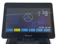 Tiene una pantalla touch de 7" con sistema Android, el cual le permite realizar cambios en las características, tales como, cambio en los pasos de 0.01, 0.12 o 0.25 D cambiar el idioma, activar o desactivar los prismas, realizar cambios en la impresión, activar el uveometro, borrar datos, etc.