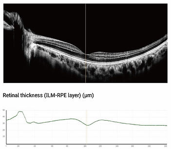 Grosor foveal macular, Mapa de cuadrícula del grosor TSNI de la capa de fibras nerviosas, Volumen retiniano total, Grosor circular de la capa de fibras nerviosas de la retina (RNFL), Grosor retiniano promedio, Mapa de cuadrícula del grosor macular, ILM-RPE de 6 x 6 mm, Mapa topográfico del grosor de la RNFL, Topograma del grosor ILM-RPE, Mapa de cuadrícula del grosor macular ILM-OPL de 6 x 6 mm, Mapa topográfico del grosor BRM-SCL, Mapa topográfico del grosor ILM-OPL y Mallas del grosor macular BRM-SCL de 6 x 6 mm